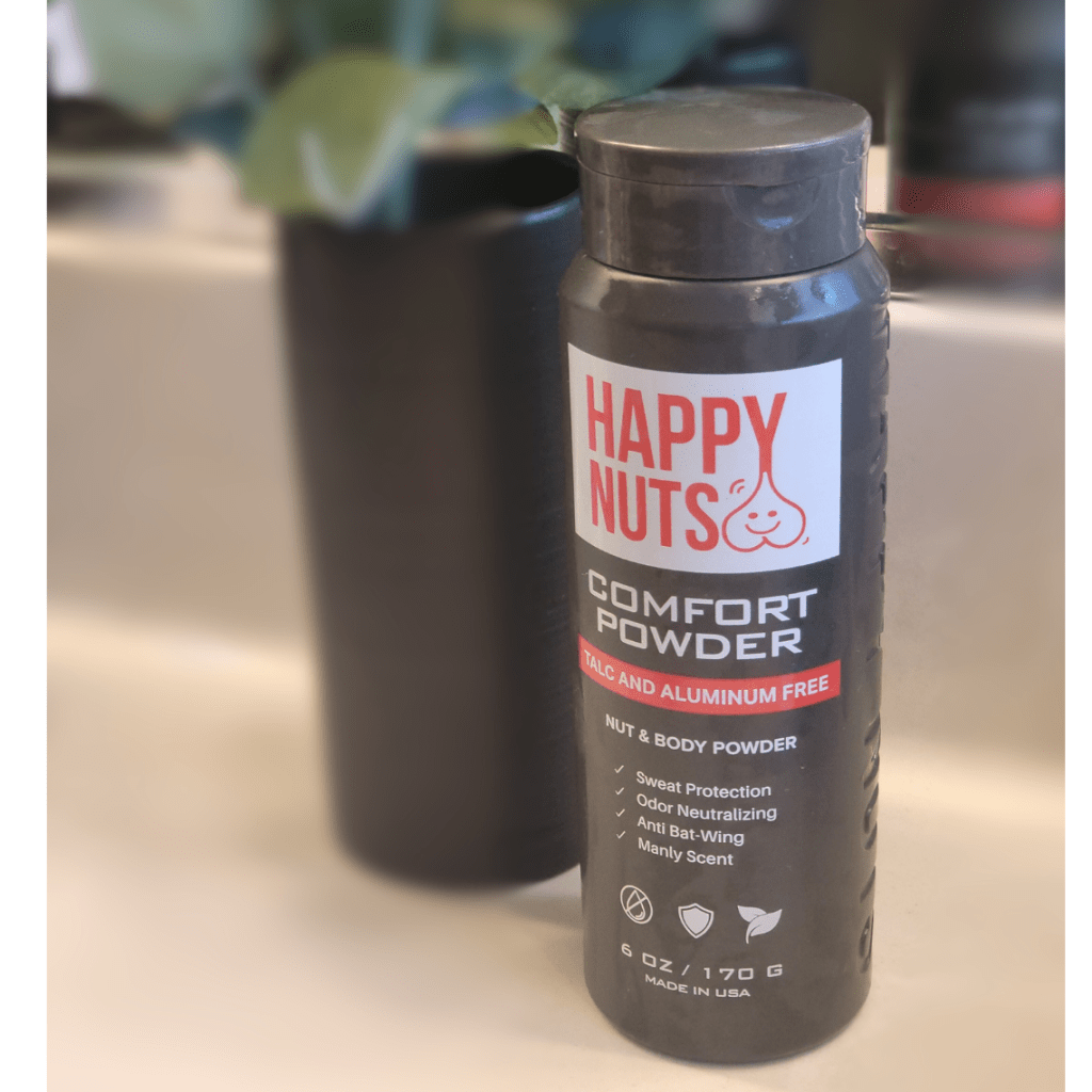 - Happy Nuts Comfort Powder: This is a talc-free, plant-based body powder that offers all-day protection against sweat, chafing, and odor, ensuring unparalleled comfort for men. Infused with aloe and coconut oil, it soothes and heals chafing, itching, and irritation. The 6-ounce package, 50% larger than most competitors, features a precision dispensing cap for easy application. Its subtle masculine scent leaves you feeling fresh and energized, and it can be used on the groin, feet, or any area prone to chafing or wetness.