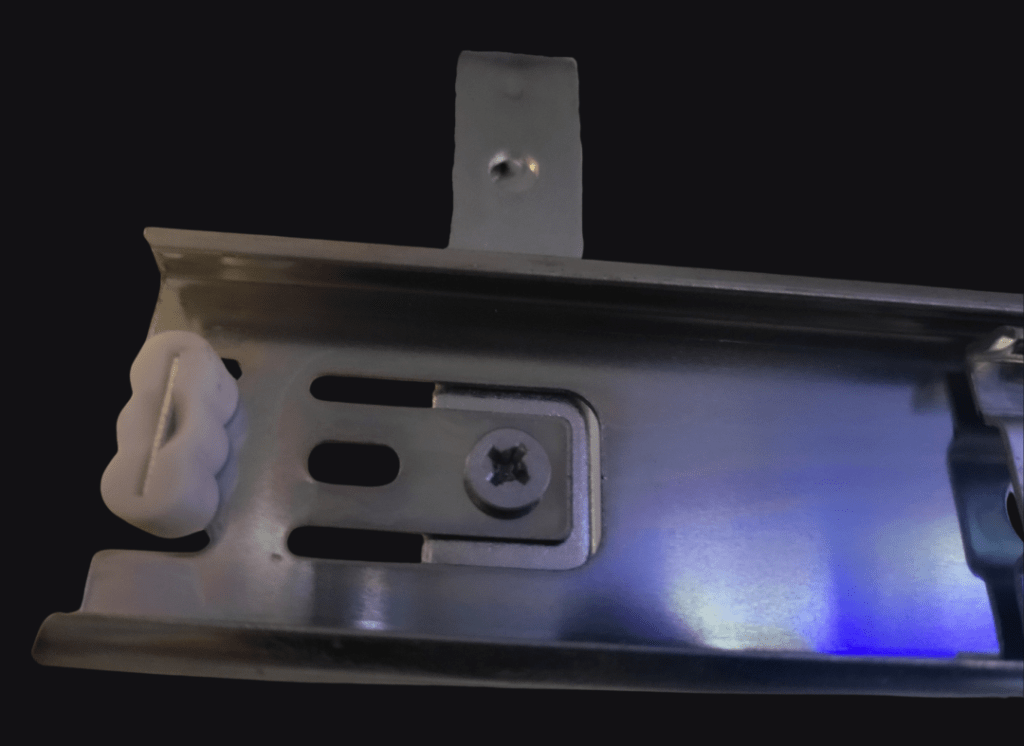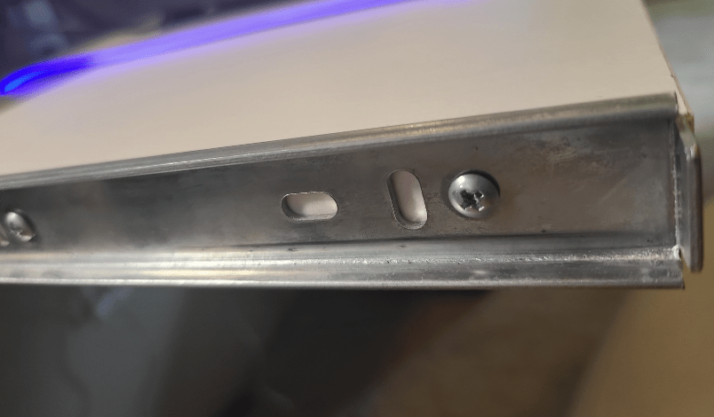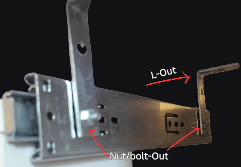 Mount the L-Brackets to the drawer slide as shown in the picture below (the head of the screw should be on the inside, the thread-bar and hex [nut]facing out.).