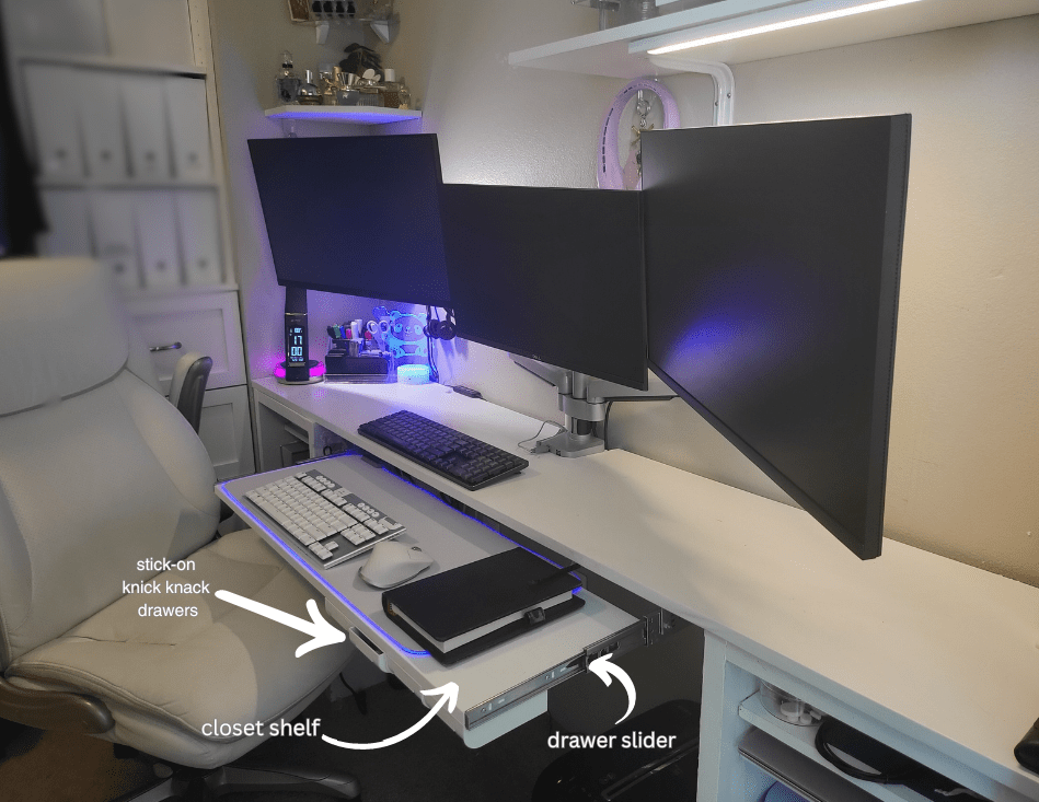 My entire workspace setup is a DIY. There isn’t much space on the main upper deskboard as you can see from the image below which is why I wanted to do more to get more of that space that I wanted. The desktop itself is a 15″wide 10′ long hardwood board scrap that I cut down to 7 feet with a mini circular saw, which I then sanded and painted white. Supporting each side of the desktop board are two Closet Maid 2-cube organizers.